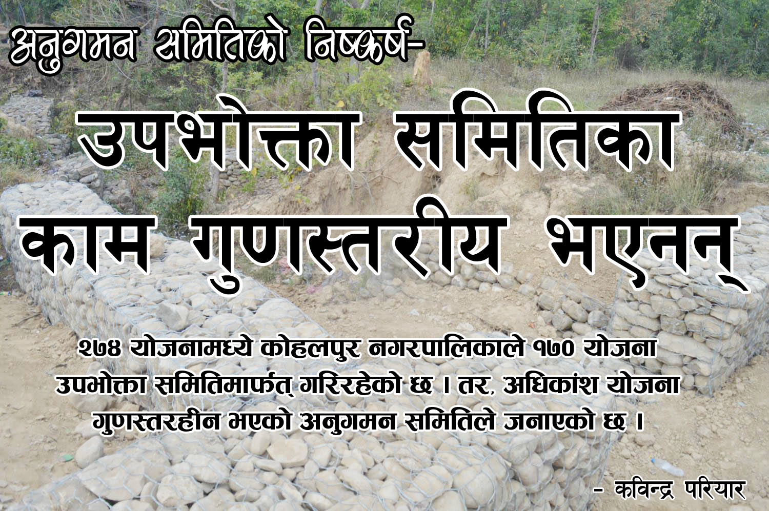 कोहलपुर नगरपालिका उपप्रमुख तथा नगरस्तरीय अनुगमन समिति संयोजक सञ्जुकुमारी थारुले उपभोक्ता समितिमार्फत् गराइएका अधिकांश योजना गुणस्तरहिन भएको बताइन् । ‘स्टिमेट’ मापदण्डभन्दा बाहिर गरेर काम गरिएकाले योजनामा गुणस्तर नभएको उनको भनाइ छ । ‘उपभोक्ता समितिमार्फत् काम गराउँदा प्रभावकारी हुन्छ भनिए पनि त्यस्तो पाइएन,’ उनले भनिन्, ‘आगामी वर्षमा नीतिगत योजना बनाएर काम गर्छौं ।’